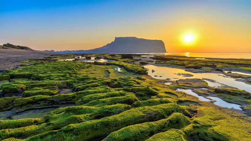 L'île de Jeju fait partie des 7 nouvelles merveilles de la nature. Située à 130 km au sud de la Péninsule coréenne, cette île volcanique est très prisée des vacanciers Sud-coréens notamment pour les lunes de miel. On y trouve la plus haute montagne du pays, Halla-san, un volcan endormi qui s'élève à 1 950 mètres au-dessus du niveau de la mer, mais aussi 368 mini-volcans, appelés oreum. Les habitants de Jeju ont développé une culture et une langue distinctes de celles de Corée du sud. L'île s'est notamment fait connaitre à travers sa structure familiale matriarcale symbolisée par les filles de la mer qui gagnent leur vie en plongeant sans bouteille au large pour récolter des produits marins. Autre curiosité, les statues en pierres volcaniques qui font penser à l'île de Pâques. Une île propice à de superbes randonnées avec ses tunnels de lave et ses cratères ciselés, ses nombreux spots de plongée et réputée pour sa gastronomie à base de fruits de mer.