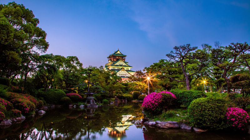 Château d'Osaka : L’œil embrasse d’un seul élan une forêt de buildings et les toitures retroussées du château d’Osaka. Sur ce beau cliché formant contraste, tout est neuf. Rien ne reste du château originel voulu par le shogun Toyotomi Hideyoshi en 1583, sinon ses énormes soubassements et la porte d’entrée Otemon. Le reste a été détruit, puis rebâti maintes fois, et les lignes du donjon actuel datent de 1930, "re-toilettées" en 1997. À l’intérieur, musée d’armements (sabres) et documents sur la vie du shogun. Au sommet, ample point de vue sur Osaka.