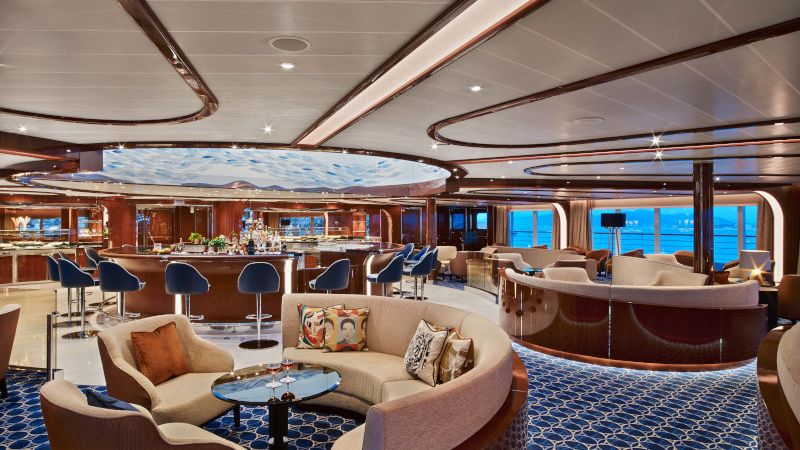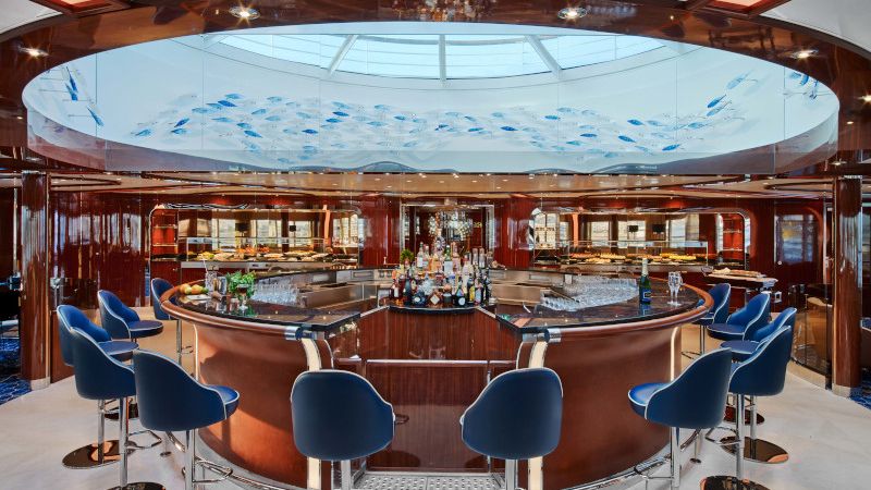 De larges baies vitrées offrent une vue panoramique sur la mer et les océans, dégageant une atmosphère propre à la détente. Les passagers apprécieront un bon café le matin, un verre entre amis après une journée passée à terre, et le soir dans une ambiance musicale, ils pourront déguster un cocktail, un cognac ou un verre de vin. Ce bar n'est pas disponible sur le Seabourn Venture et le Seabourn Pursuit.